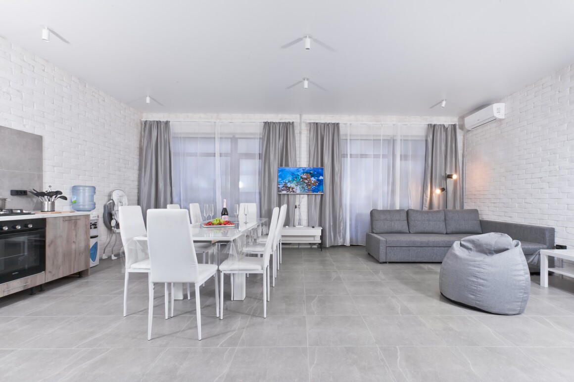 👌🏠 ХОРОШИЙ ДОМ 🏠👌 – это дуплекс, выполненный в стиле лофт, с большим количеством свободного пространства, общей площадью 180м2 на каждую половину, теплыми полами во всех помещениях, светлыми монохромными тонами интерьера и разносторонними панорамными окнами, что делает его привлекательным для большинства наших гостей.